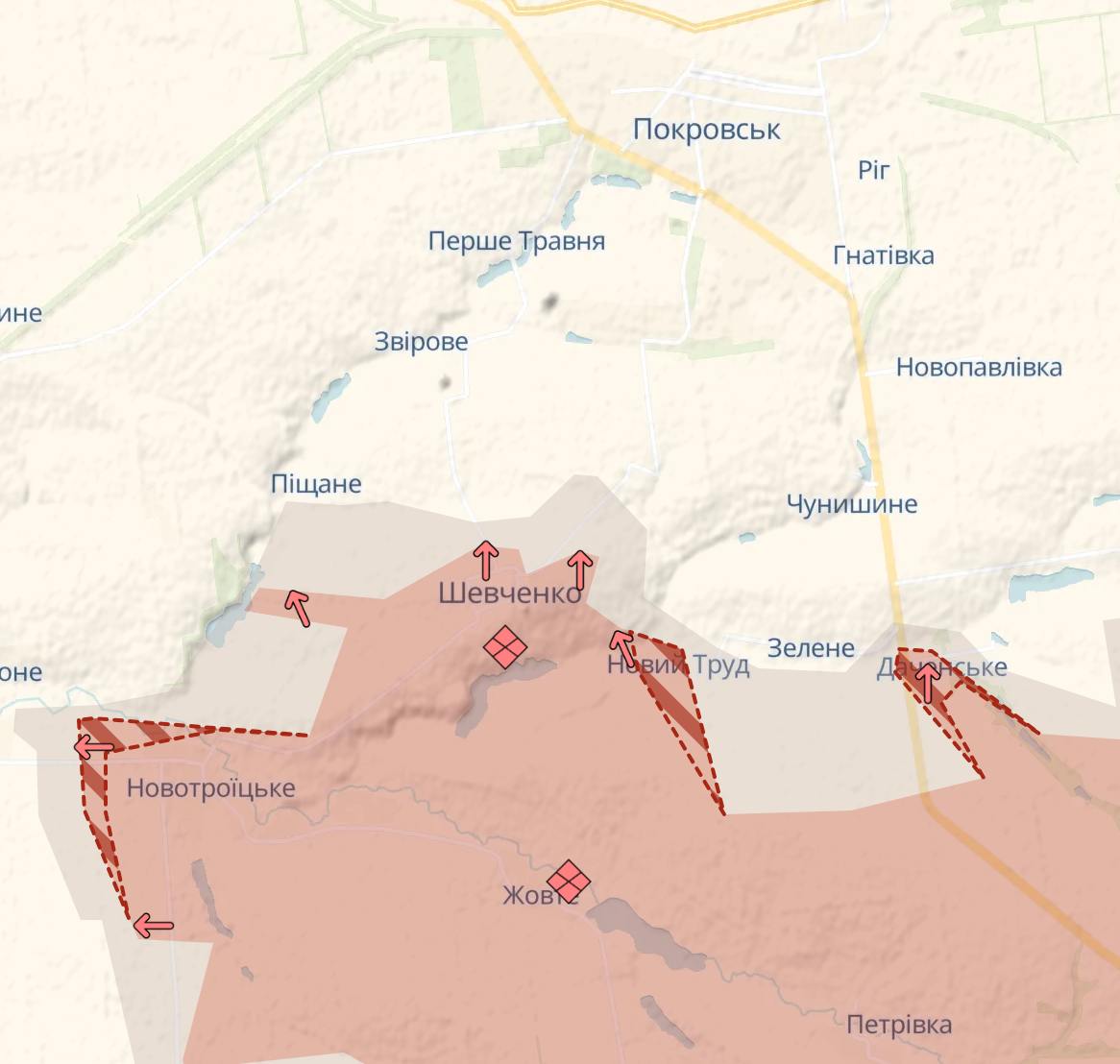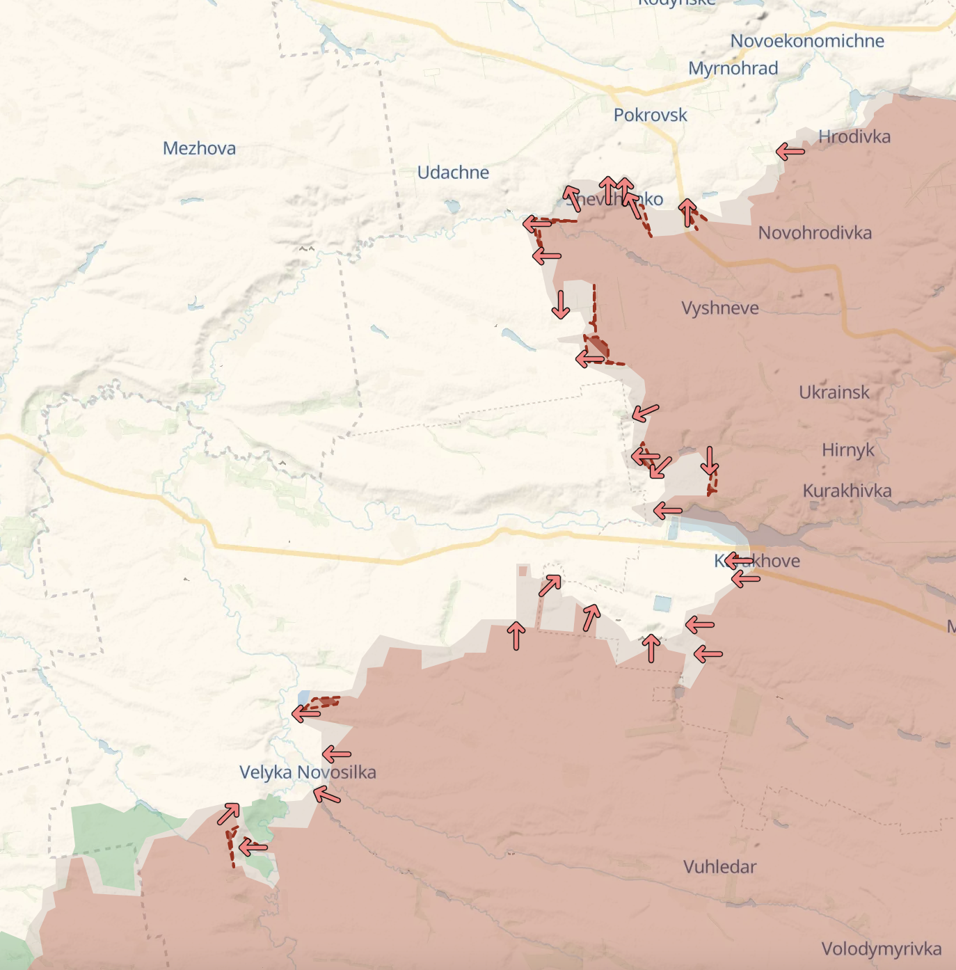 Россияне снова продвинулись под Покровском, свидетельствует карта Deep State. В частности, есть продвижение по трассе с юга в Даченском.