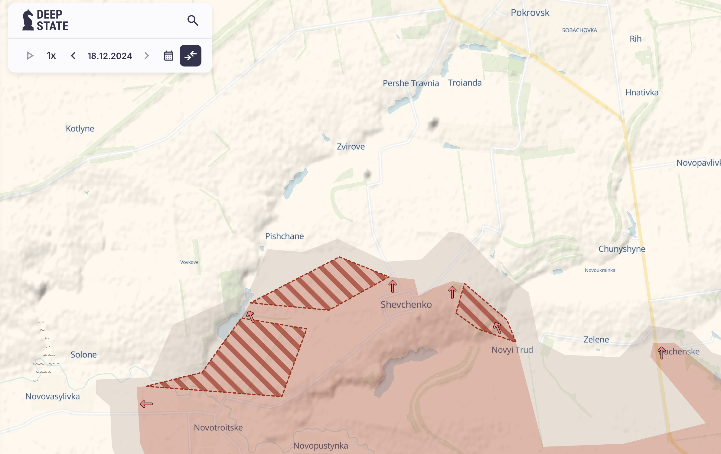 Россияне за минувшие сутки продвинулись под Покровском, войдя в село Песчаное (из которого раньше контратаковали ВСУ). Об этом свидетельствует карта военного паблика Deep State.