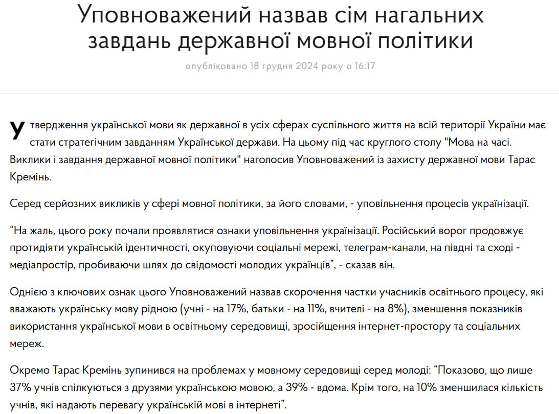 "Показательно, что только 37% учеников общаются с друзьями на украинском языке, а 39% – дома. Кроме того, на 10% уменьшилось количество учеников, предпочитающих украинский язык в интернете", – поделился статистикой языковой омбудсмен.