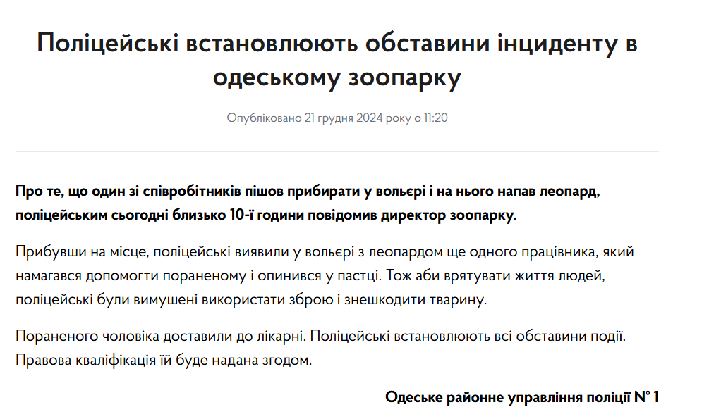 Сегодня утром в Одесском зоопарке леопард напал работника, который пришел убирать в вольере. Полицейские вынуждены были использовать оружие и обезвредить животное.