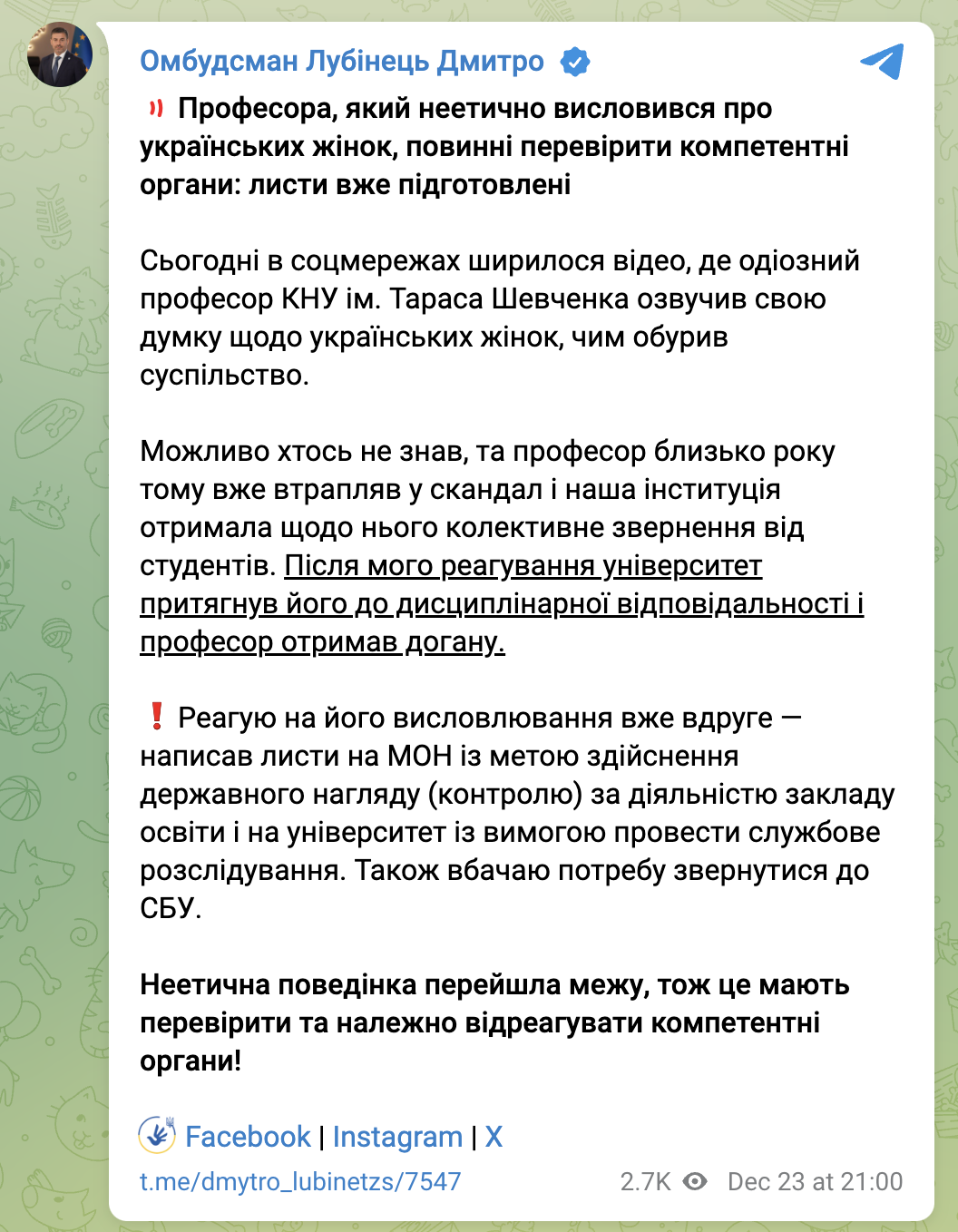 "Сегодня в соцсетях ширилось видео, где одиозный профессор КНУ им. Тараса Шевченко озвучил свое мнение по поводу украинских женщин, чем возмутил общество. Реагирую на его высказывание уже второй раз – написал письма на МОН с целью осуществления государственного надзора (контроля) за деятельностью учебного заведения и на университет с требованием провести служебное расследование", – заявил Лубинец.