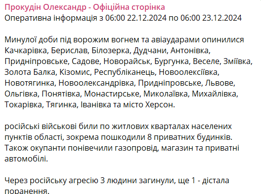 08:00 За прошедшие сутки в результате российских обстрелов в Херсонской области 3 человека погибли, еще 1 - получил ранения.