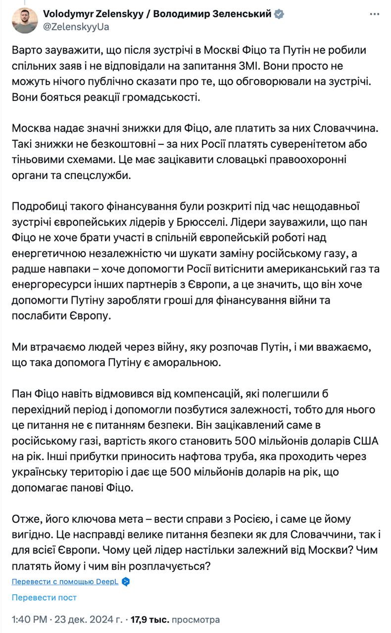 Москва предоставляет значительные скидки Фицо, но платит за них Словакия. Такие скидки не бесплатны – за них России платят суверенитетом или теневыми схемами. Это должно заинтересовать словацкие правоохранительные органы и спецслужбы", - сказано в публикации Зеленского.