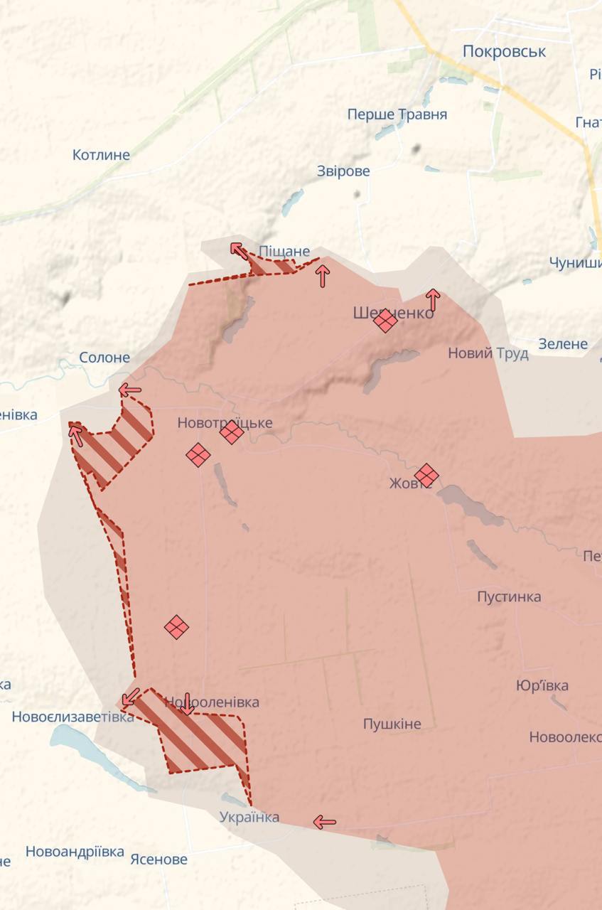 Также российские войска продвигаются в Песчаном к югу от Покровска, одновременно пытаясь обойти его с запада.