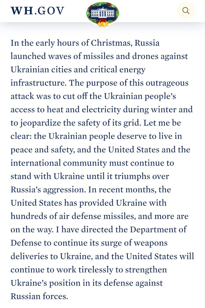 Уходящий президент США Джо Байден поручил Пентагону усилить поставки оружия в Украину после ракетного удара в ночь на 25 декабря.