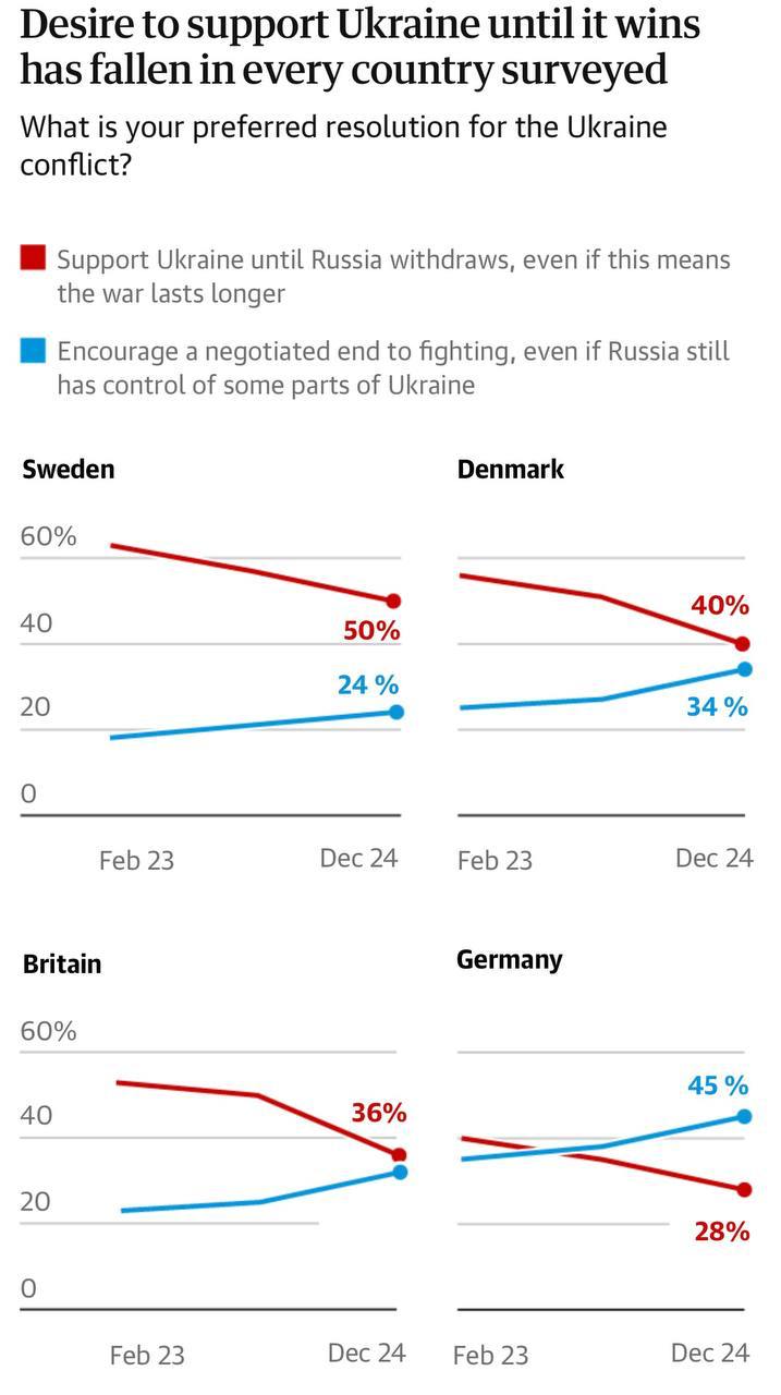 О настроениях европейского населения на этот счет красноречиво пишет британская газета The Guardian со ссылкой на опрос YouGov. Ориентация на победу Киева в этой войне упала во всех семи странах, где опрашивали людей: Франция, Германия, Италия, Испания, Швеция, Дания и Великобритания.
