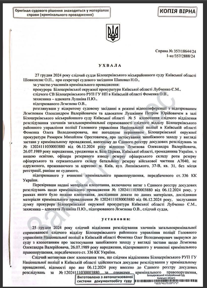 "6.12.2024, когда он прибыл в Белоцерковский ТЦК и ему была зачитана повестка о необходимости прибыть на сборный пункт ТЦК для отправки военнообязанных в ряды ВСУ и был предупрежден об уголовной ответственности за уклонение от призыва, отказался от получения повестки в присутствии двух свидетелей, которые были допрошены в суде. Соответственно в определенное время Леменов не явился на сборный пункт, о причинах неявки не сообщил. 8.12.2024 А.Леменову было поставлено в известность о подозрении в совершении уголовного правонарушения по ст.336 Уголовного кодекса, которая предусматривает наказание в виде лишения свободы сроком до 5 лет. До этого, начиная с 24.11.2024, А.Леменов уклонялся от посещения Белоцерковского ТЦК и, как следствие, был объявлен в розыск", - заявляет следователь.