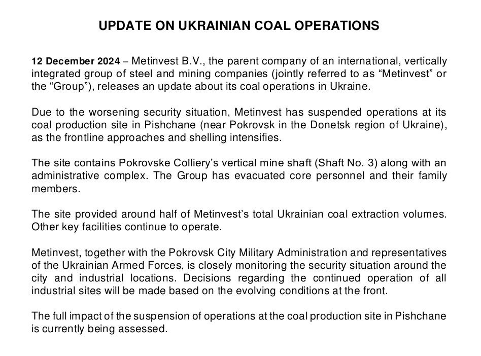 О ее закрытии в связи с приближением фронта компания "Метинвест" заявляла ещё 12 декабря. И добавляла, что добывала здесь половину всего своего объема угля.