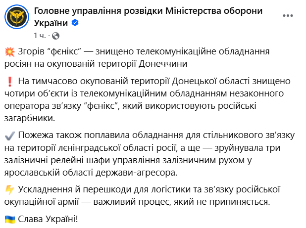 "На временно оккупированной территории Донецкой области уничтожены четыре объекта с телекоммуникационным оборудованием незаконного оператора связи "феникс"", - говорится в сообщении.