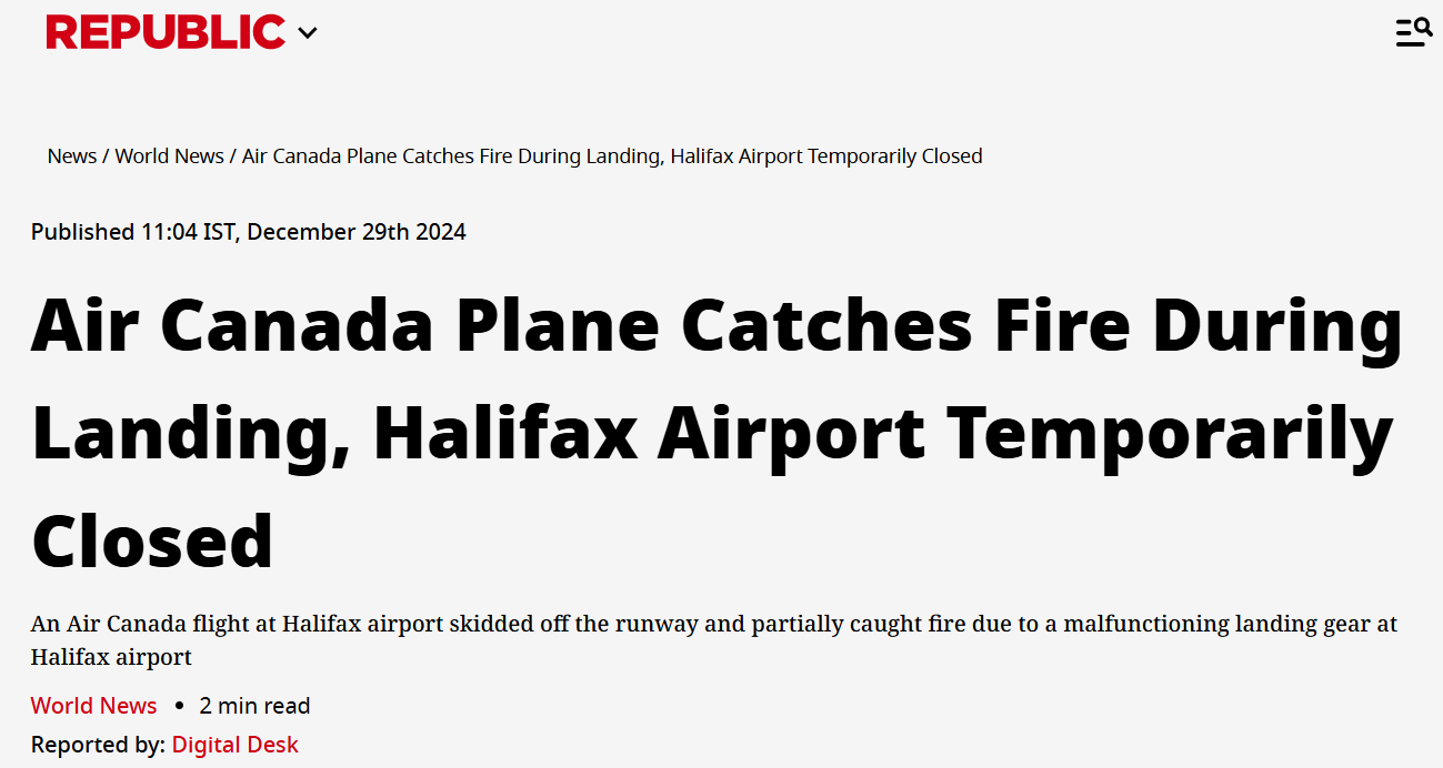 Самолет авиакомпании Air Canada в аэропорту Галифакса выкатился за пределы взлетно-посадочной полосы и частично загорелся из-за неисправности шасси в аэропорту Галифакса.
