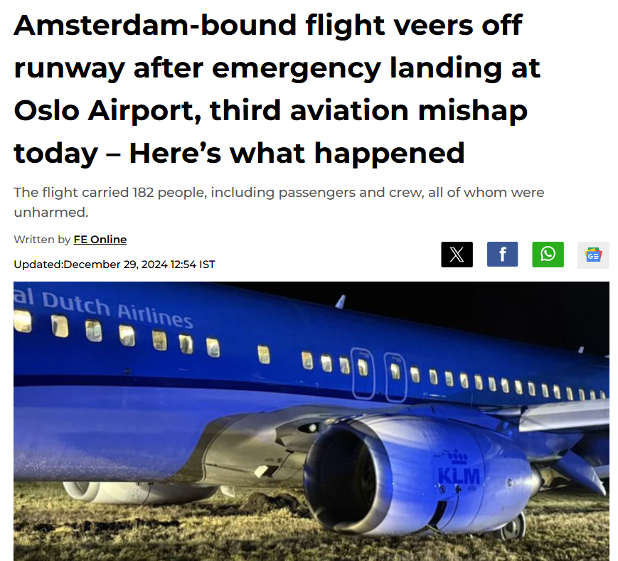 Еще одна авария с самолетом произошла сегодня в Норвегии. Самолет Boeing 737-800 авиакомпании KLM Royal Dutch Airlines был вынужден совершить аварийную посадку в аэропорту Осло Торп Сандефьорд из-за неисправности в гидравлической системе.