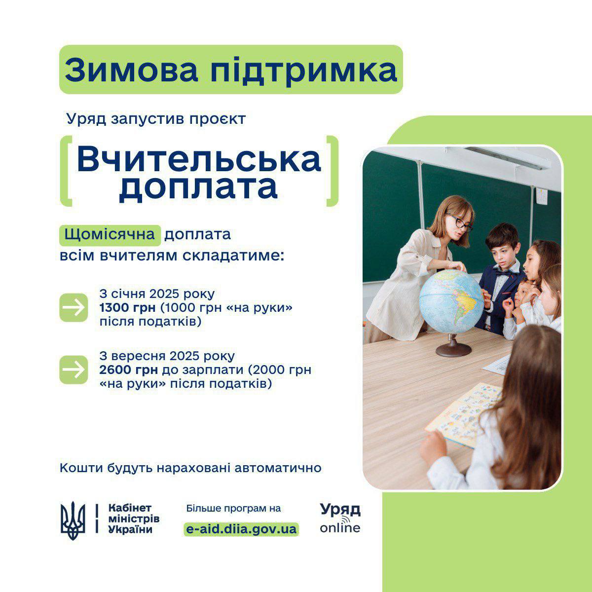 В Украине с 1 января 2025 года учителям будет ежемесячно выплачиваться дополнительная 1000 грн в рамках программы "Зимней поддержки" - "Учительская доплата". Это с учетом налогов.
