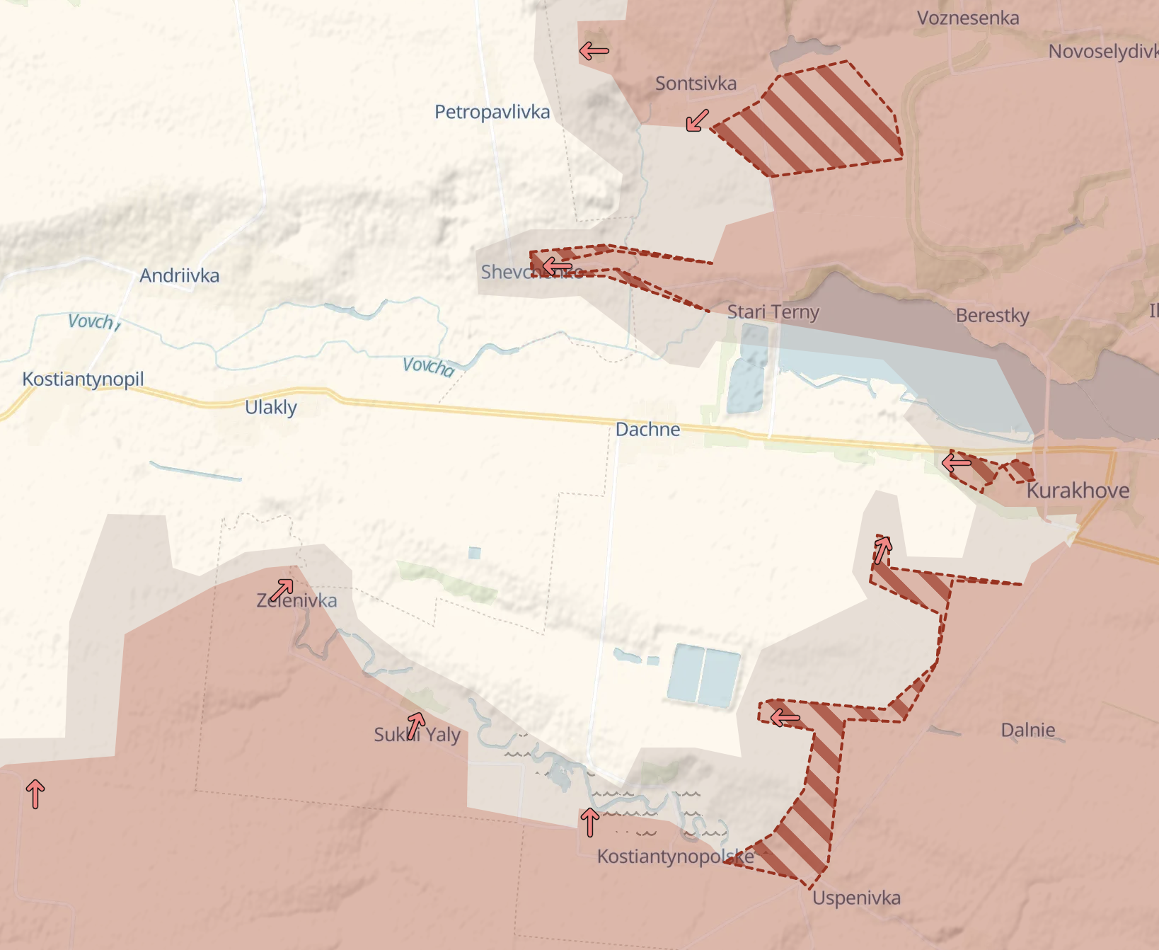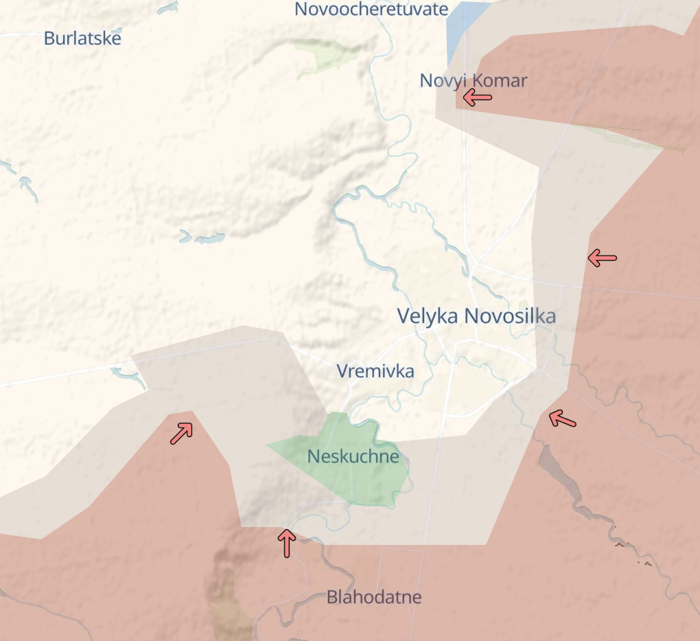 Также полностью в "серой зоне" оказалось Нескучное к югу от поселка, что создает угрозы уже прямым подступам к Великой Новоселке - Времьевке. Причем этой деревне россияне угрожают как с юга, так и с западного фланга.