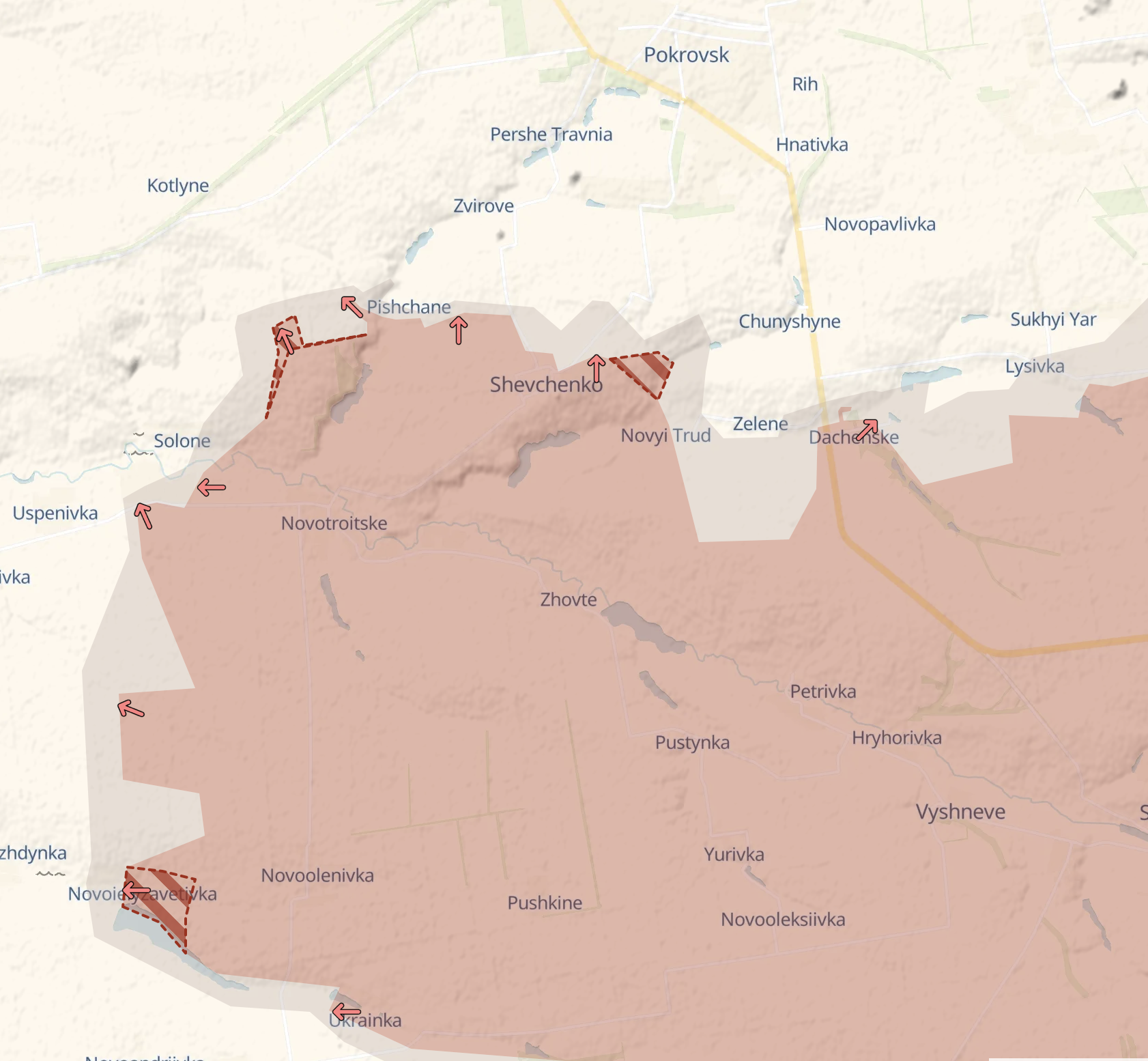 На Покровском направлении уже очевидно, что брать в лоб Покровск российские войска не хотят и пытаются с одной стороны "обжимать" город по флангам, с другой - наступая южнее Покровска сразу в направлении Днепропетровской области.