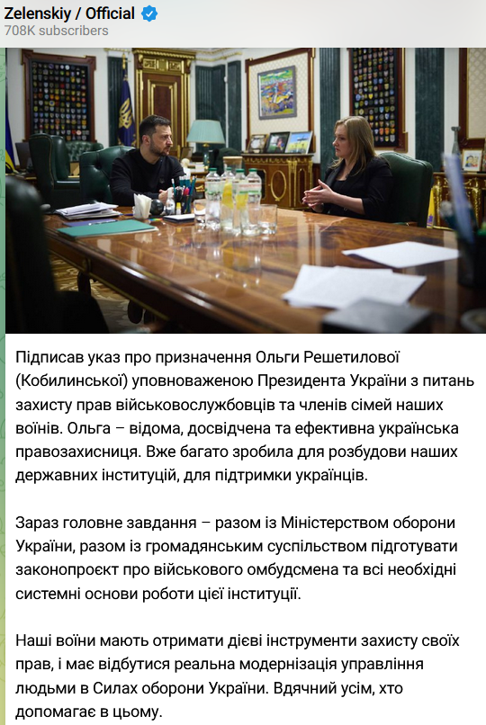 "Ольга – известная, опытная и эффективная правозащитница. Уже многое сделала для развития наших государственных институций, для поддержки украинцев. Сейчас главная задача – вместе с Министерством обороны Украины, вместе с гражданским обществом подготовить законопроект о военном омбудсмене и все необходимые системные основы работы этого института", - сказано в публикации Зеленского.