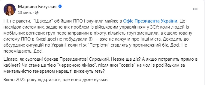 "Это следствие системных, застарелых проблем с военным управлением в ВСУ: когда людей из мобильных огневых групп перенаправили в пехоту, количество групп уменьшили, а эшелонированную систему ПВО в Киеве до сих пор не построили (!) — не говоря уже о других городах. Доходит до абсурдных ситуаций по Украине, когда те же "Пэтриоты" ставят в противоположную сторону. До сих пор. Не перемещают. До сих пор", - написала депутат.