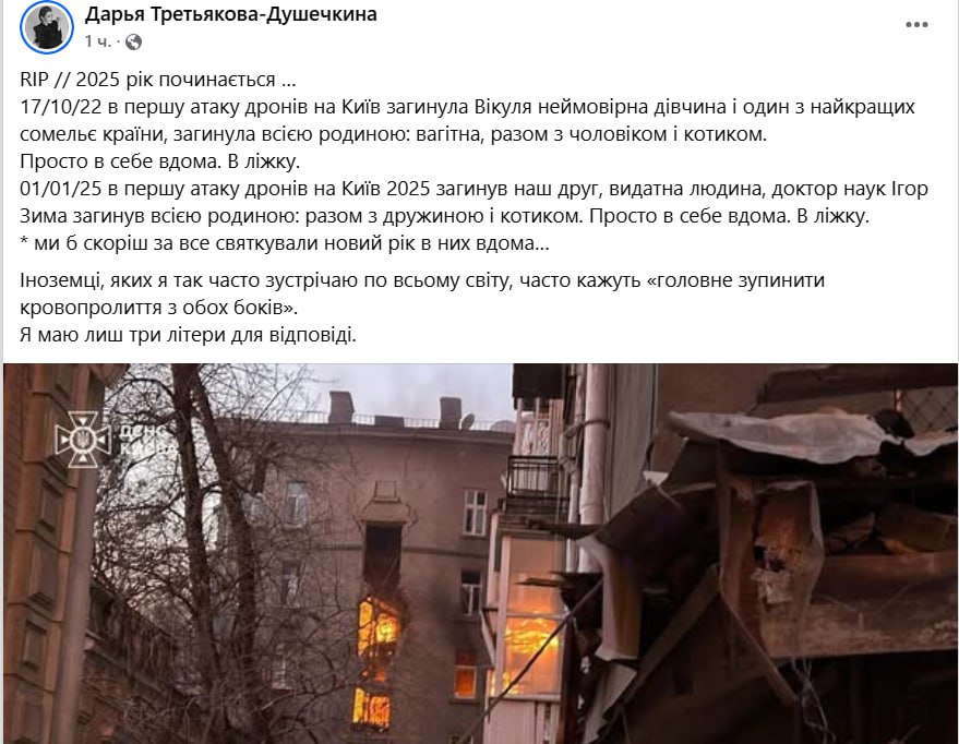 "01/01/25 в первую атаку дронов на Киев 2025 года погиб наш друг, выдающийся человек, доктор наук Игорь Зима. Погиб всей семьей: вместе с женой и котиком. Просто у себя дома", – написала женщина.