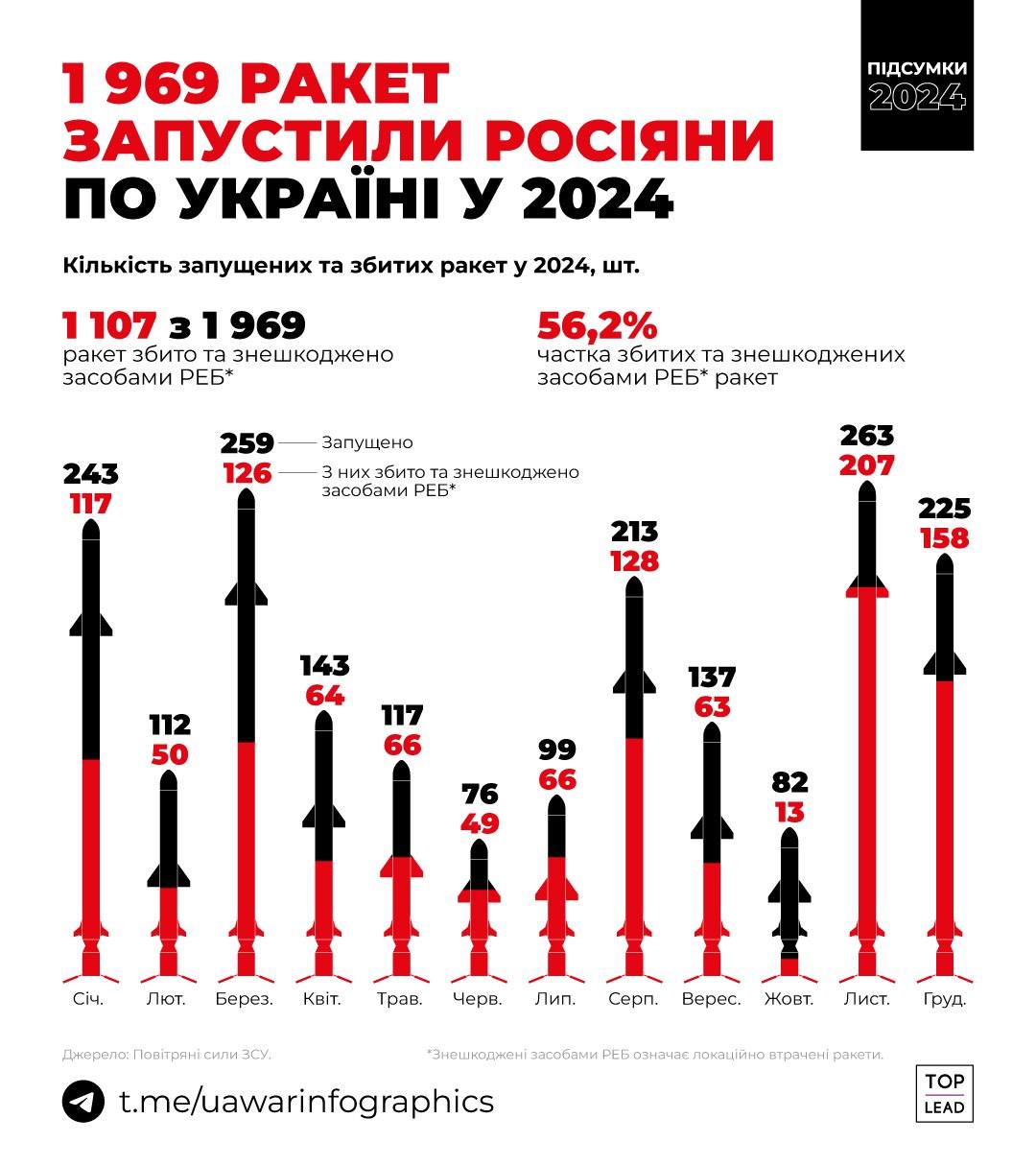 17:29 Россия в ушедшем году запустила по Украине около двух тысяч ракет. Сбиты либо отклонены от целей с помощью РЭБ из них 56%.