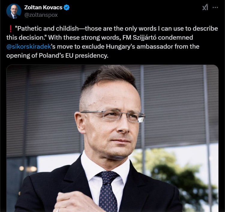 "Жалко и по-детски - это единственные слова, которыми я могу описать это решение", - написал госсекретарь по публичной дипломатии и связям с общественностью Венгрии Золтан Ковач в соцсети Х передавая слова главы МИД Петера Сийярто.