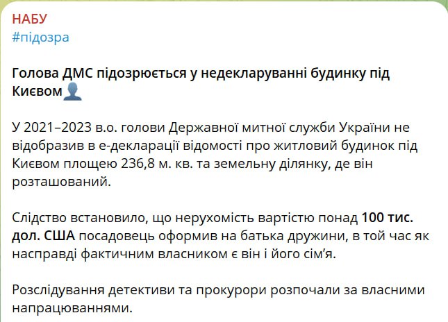 По данным следствия, в 2021-2023 и. о. главы таможни не отразил в электронной декларации сведения о жилом доме под Киевом площадью 236,8 кв. м и земельный участок, на котором дом расположен.