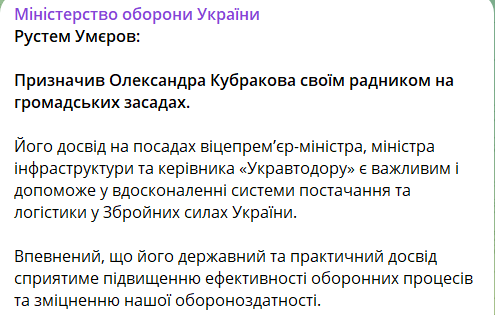 По его словам, опыт Кубракова "поможет в совершенствовании системы снабжения и логистики" в ВСУ.