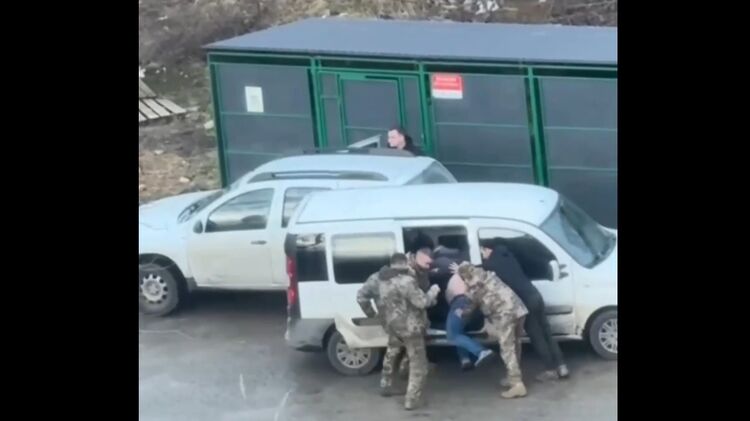 Сотрудники ТЦК бьют мужчину по ногам и рукам, чтобы запихнуть в бус.