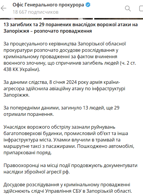 В Офисе генпрокурора сообщили, что в результате удара по Запорожью пострадали промышленный объект, многоэтажные дома и другая инфраструктура города.