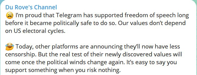 "Я горжусь тем, что Telegram поддержал свободу слова задолго до того, как это стало политически безопасно. Наши ценности не зависят от избирательных циклов в США", - написал Дуров.