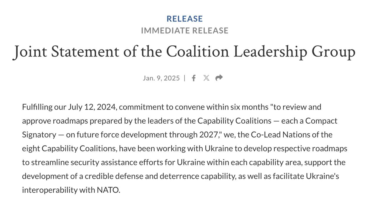 "Ориентируясь на целевые показатели потенциала к 2027 году, наши страны планируют тесно сотрудничать с Украиной, чтобы определить, как достичь этих контрольных показателей, сбалансировав потребности Украины как в военное время, так и в будущем, посредством наших соответствующих национальных пожертвований, закупок, инвестиций и усилий по расширению потенциала оборонной промышленной базы, в том числе за счет использования возможностей производства и поддержания национальной оборонной промышленности Украины", - говорится в сообщении.