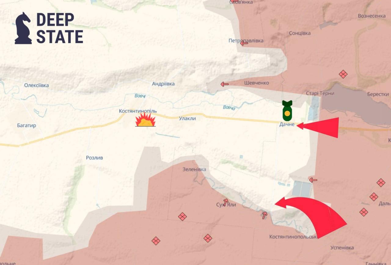 При этом пока по-прежнему неясно, будут ли россияне рваться к Днепропетровской области, либо предпочтут повернуть севернее и блокировать Покровск с запада (либо будут решать одновременно обе этих задачи).
