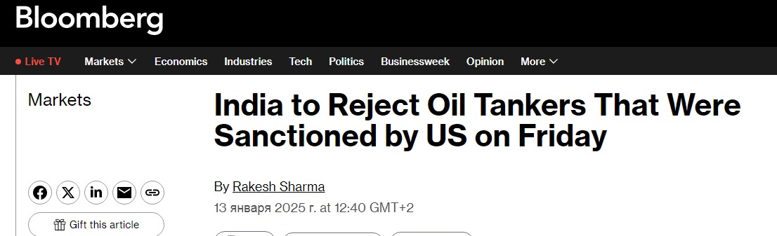 Индия намерена отказаться от приема  в своих портах нефтяных танкеров, на которые США наложили санкции за их роль в перевозке грузов для России.