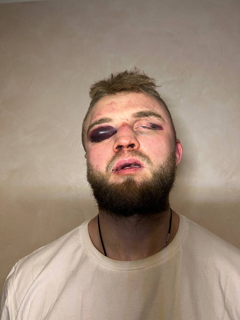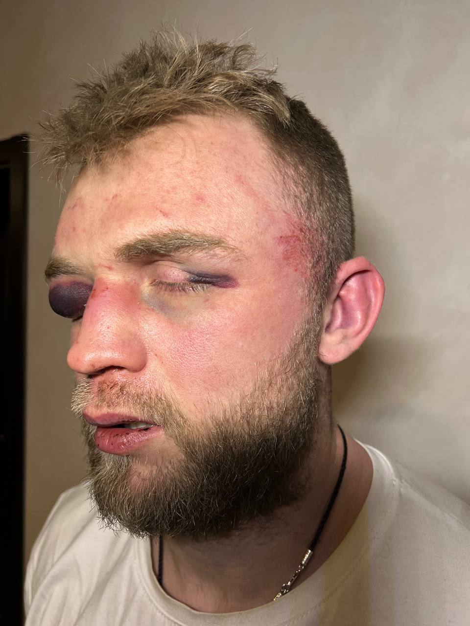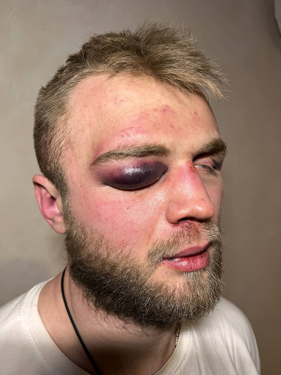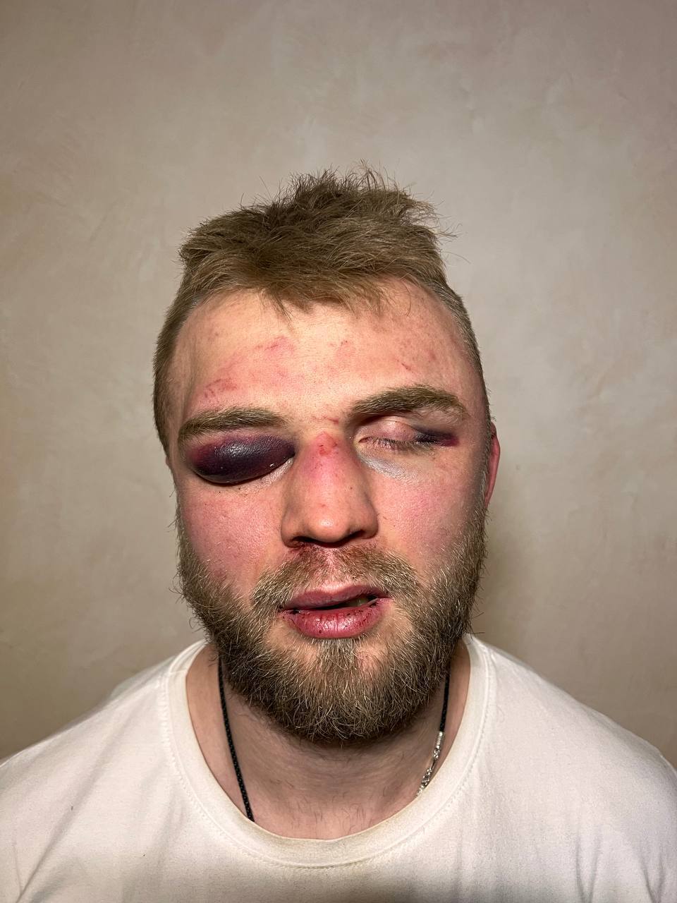 Дмитрук опубликовал фото, на которых у него полностью отек от ударов правый глаз и деформирован череп, сломаны нос и уши.