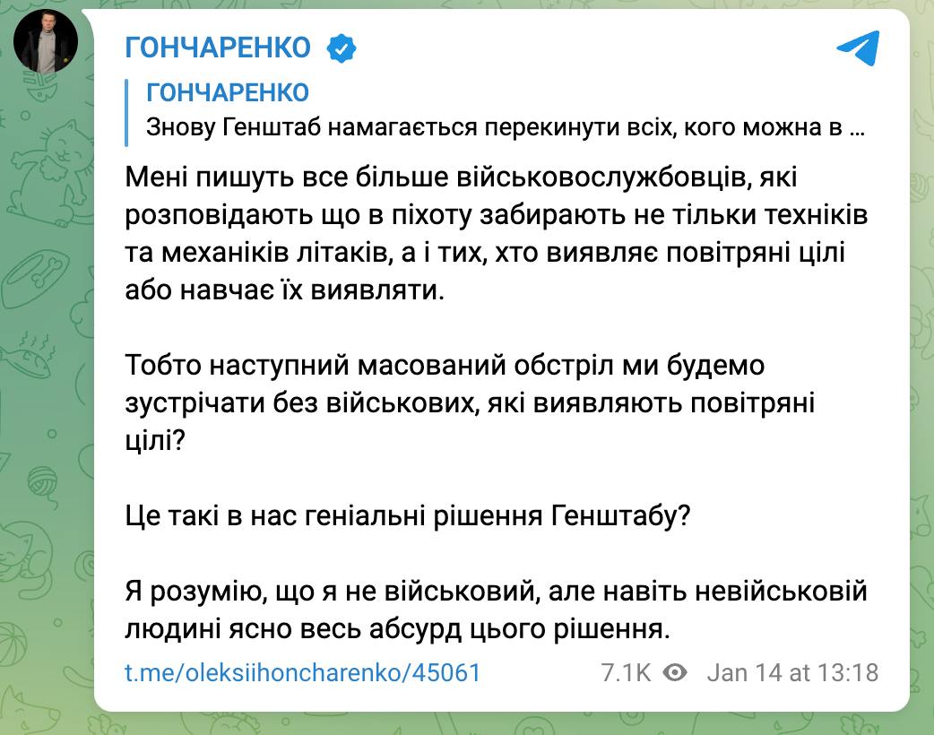 13.26 В пехоту забирают не только техников и механиков самолетов Воздушных сил, но и тех, кто обнаруживает воздушные цели или учит их обнаруживать. Как заявляет нардеп Гончаренко, ему все чаще об этом сообщают военные.