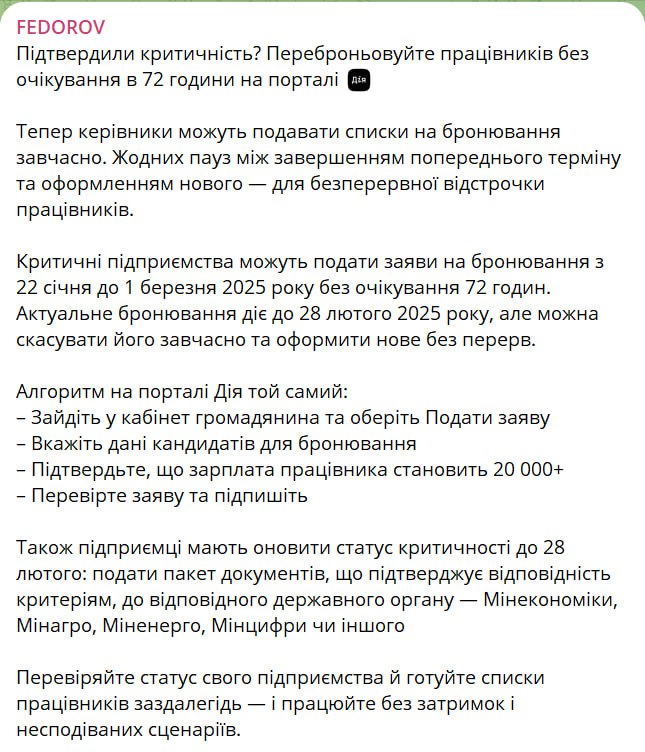 "Подтвердили критичность? Перебронируйте работников без ожидания в 72 часа на портале "Дия". Теперь руководители могут подавать списки на бронирование заранее. Никаких пауз между завершением предыдущего срока и оформлением нового – для непрерывной отсрочки работников", – написал Федоров.