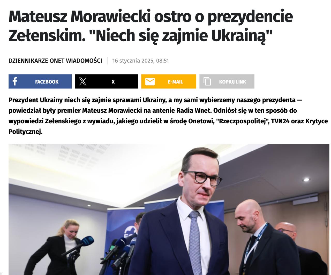 "Пусть президент Украины занимается украинскими делами, а мы сами выберем своего президента. Он имеет право – и даже обязан – преследовать интересы своей страны, но именно мы здесь решаем, кто является кандидатом и у кого какие взгляды по самым принципиальным вопросам", – заявил Моравецкий.