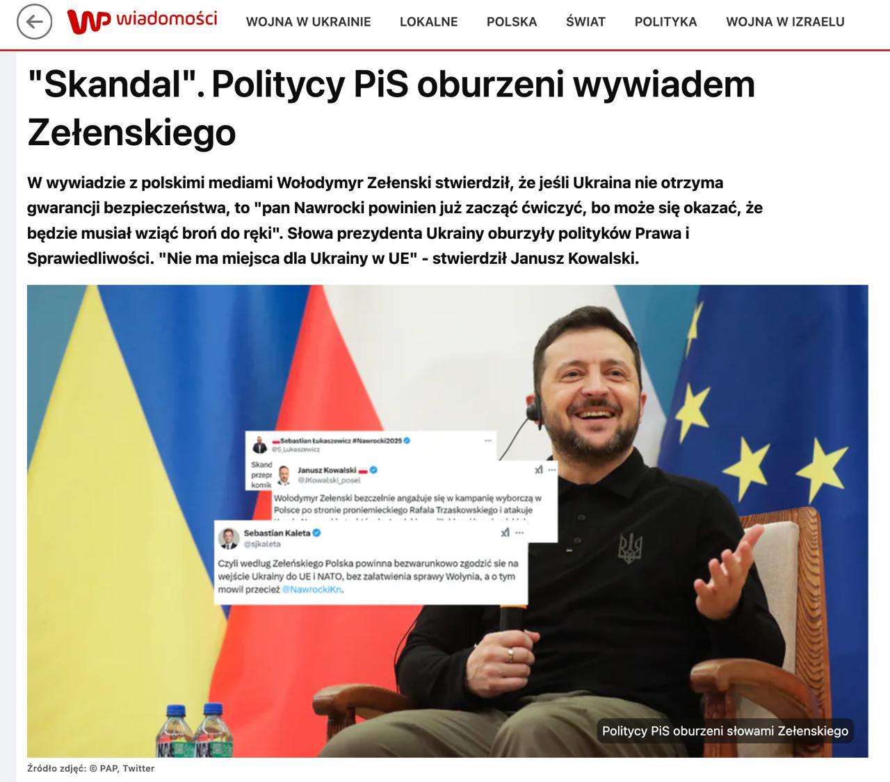 Зеленский накануне заявил польским СМИ, что кандидату ПиС Каролю Навроцкому нужно "тренироваться, чтобы защищать страну самому с оружием в руках", поскольку тот заявлял, что не видит Украину в НАТО и ЕС, пока не будет решен вопрос Волынской трагедии.