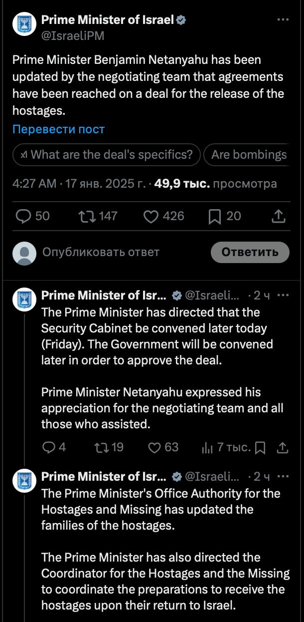 Израильский премьер-министр Биньямин Нетаньяху подтвердил, что заключена сделка с ХАМАС по освобождению заложников и прекращению огня в секторе Газа.