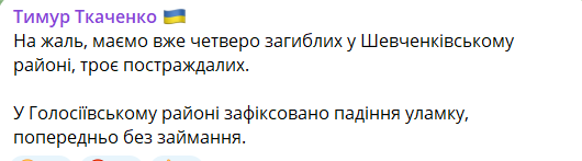 "К сожалению, уже четверо погибших в Шевченковском районе, трое пострадавших", - написал главы КГВА Тимур Ткаченко.
