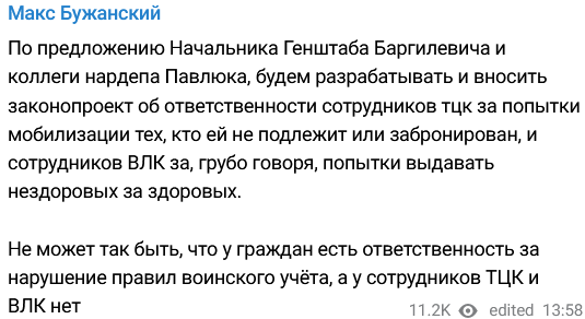 "Будем разрабатывать и вносить законопроект об ответственности сотрудников ТЦК за попытки мобилизации тех, кто ей не подлежит или забронирован, и сотрудников ВВК за, грубо говоря, попытки выдавать нездоровых за здоровых. Не может так быть, что у граждан есть ответственность за нарушение правил воинского учёта, а у сотрудников ТЦК и ВВК нет", - написал Бужанский.