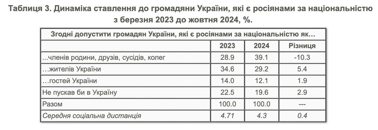 А вот к русским по национальности гражданам Украины отношение хуже. Готовы допустить их в свое окружение 39%, а 29% соглашаются с утверждением, что они должны жить в Украине (итого 68%). Нетерпимое отношение к ним имеют 32% опрошенных. При этом нетерпимых за полтора года стало на 10% меньше. В 2023 году 22,5% опрошенных жителей Украины заявили, что русских не следовало бы пускать в страну, в 2024-м - 19,6%.