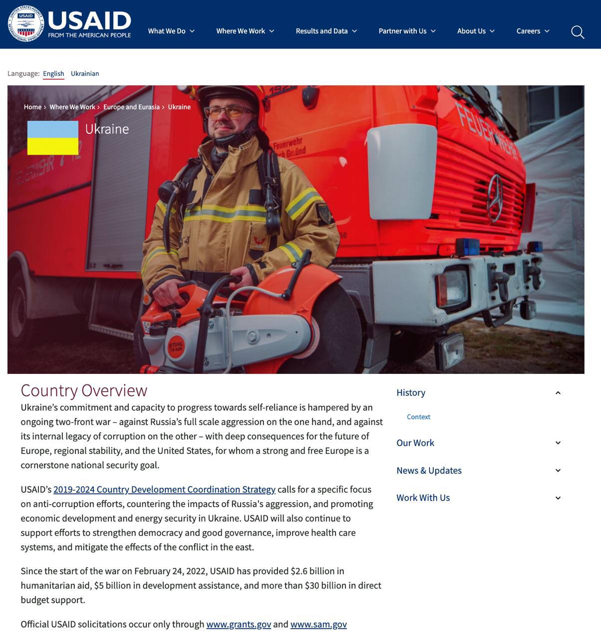 Как говорится на сайте Агентства, с 24 февраля 2022 года USAID предоставило Украине гуманитарную помощь на сумму 2,6 млрд долларов США, помощь в целях развития на сумму 5 млрд долларов США и более 30 млрд долларов США в виде прямой бюджетной поддержки.