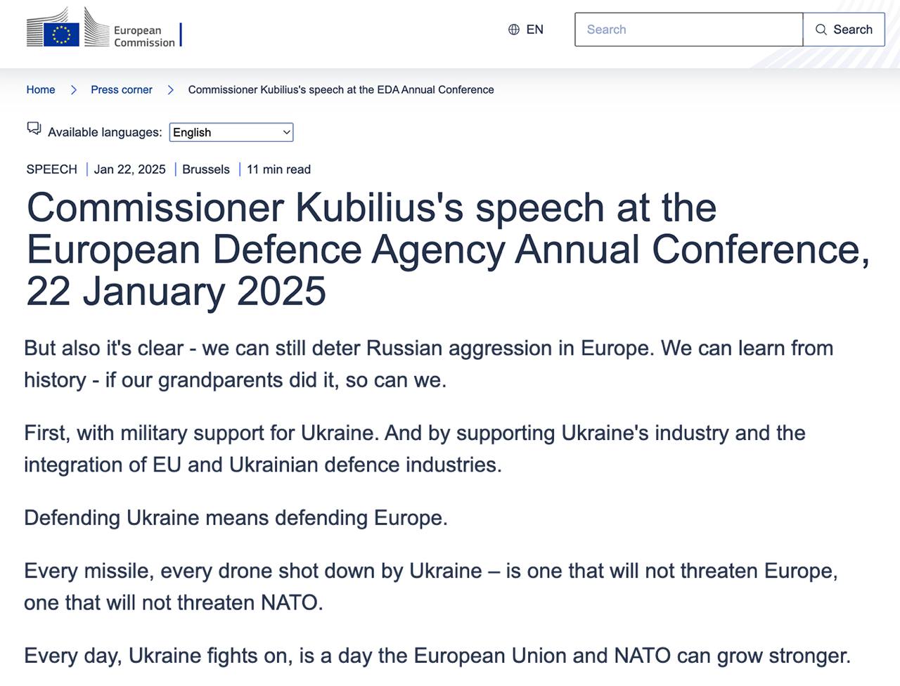 "Мы все еще можем сдерживать российскую агрессию в Европе. Во-первых, с помощью военной поддержки Украины. И с помощью поддержки украинской промышленности и интеграции оборонной промышленности ЕС и Украины. Защищая Украину, мы защищаем Европу. Каждая ракета, каждый беспилотник, сбитый Украиной, — это те, которые не будут угрожать Европе, те, которые не будут угрожать НАТО. Каждый день, пока Украина продолжает бороться, - это день, когда Европейский союз и НАТО могут стать сильнее", - заявил Кубилюс.