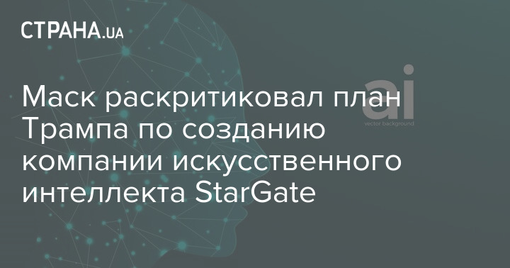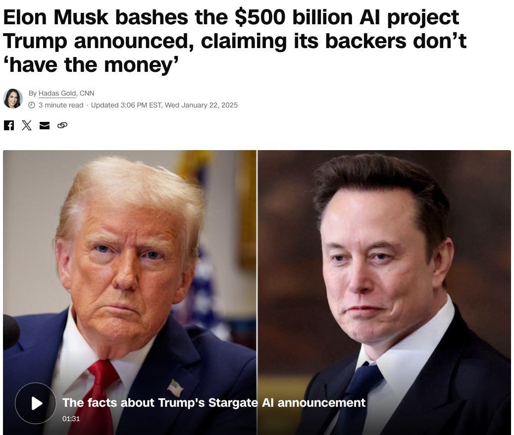 Илон Маск раскритиковал план Дональда Трампа по созданию компании StarGate для развития искусственного интеллекта с инвестициями в 500 миллиардов долларов.