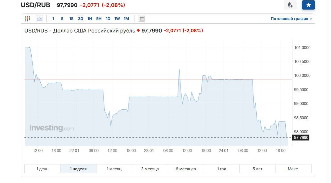 С начала недели безналичный курс рубль/доллар существенно укрепился. Понедельник рынок начал высоко, с уровня 102,6 руб./$, к среде курс доллара проседал до 98,22 руб./$, а в пятницу отступил на 97,8 руб./$.