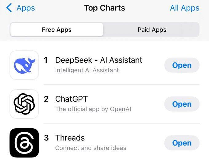 Китайская модель искусственного интеллекта от стартапа DeepSeek впервые обошла ChatGPT, став самым рейтинговым бесплатным приложением, доступным в App Store. Модель также "вызвала панику по всей Кремниевой долине".