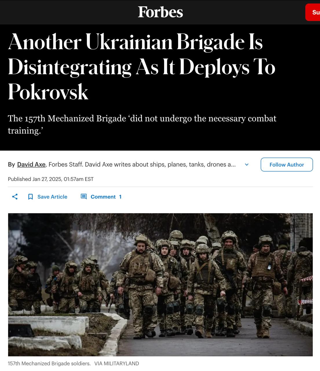Вторая за месяц бригада ВСУ "распадается по мере развертывания на передовой". Речь идет о 157-й отдельной механизированной бригаде, которую отправляют под Покровск.