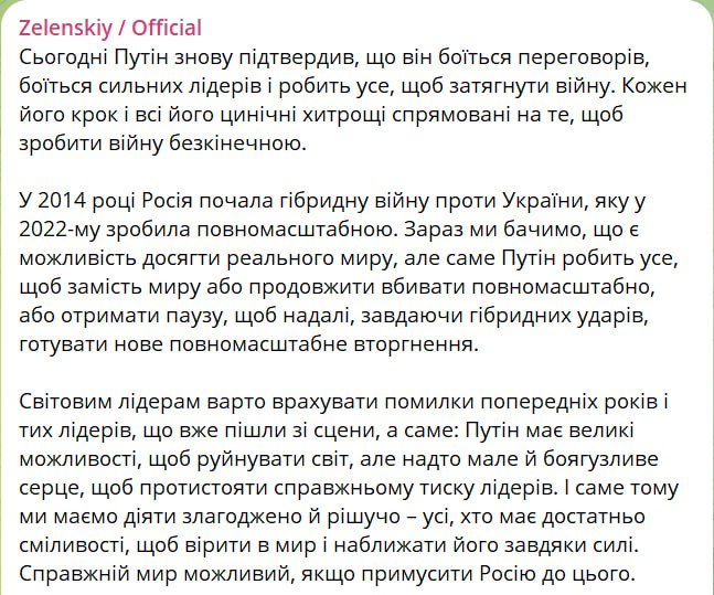 "Сегодня Путин снова подтвердил, что он боится переговоров, боится сильных лидеров и делает все, чтобы затянуть войну. Каждый его шаг и все его циничные уловки направлены на то, чтобы сделать войну бесконечной", – заявил Зеленский.