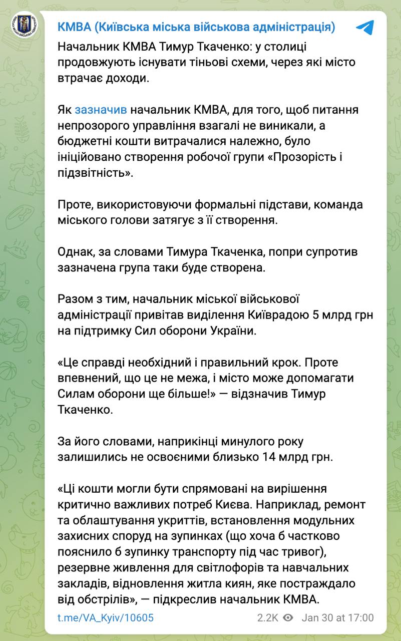 Также он упомянул выделение Киевсоветом 5 миллиардов гривен в поддержку Сил обороны Украины и намекнул, что столица могла бы дать военным больше.