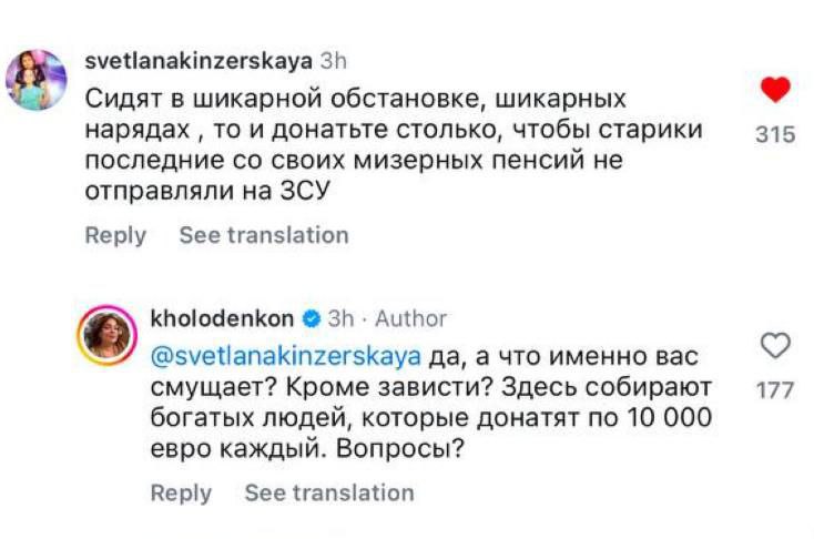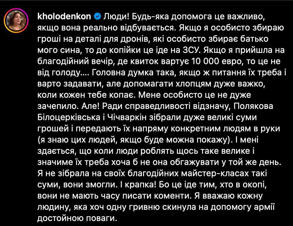 После этого Холоденко удалила видео с Поляковой и написала новый пост, где заявила, что неважно, как собирать деньги, главное, что эти средства "идут в окопы". И призвала "не обгаживать тех людей, которые делают столь большое и значимое".