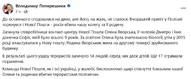 "До последнего надеялись на чудо, но его, к сожалению, не произошло. Вчерашний прилет в Полтаве коснулся и "Новой Почты" – Россия убила нашу коллегу и ее семью. Погибла сотрудница контакт-центра "Новой Почты" Елена Яворская, ее муж Дмитрий и их дочь София, которой было всего 9 лет", - написал Поперешнюк.